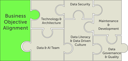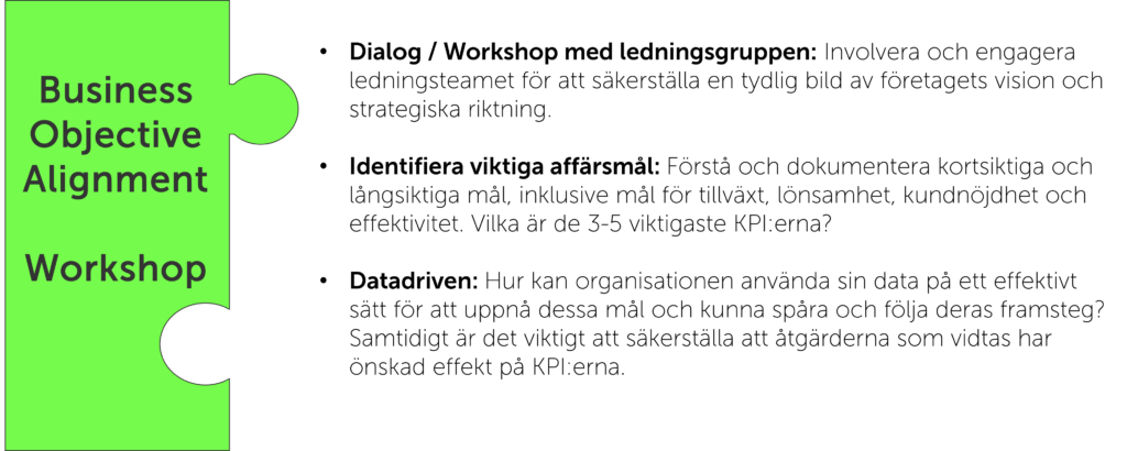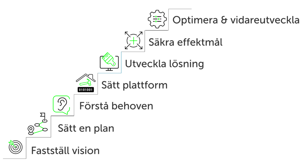 Affingo har tagit fram en 7-stegsmodell som vi använder oss av för att hjälpa organisationer att bli mer datadrivna och i det säkerställa både kvalitet samt att både IT och verksamhet arbetar tillsammans mot samma affärsmål. Se bild till vänster för processen och läs mer nedan om komponenterna. Processen i införandet visualiseras i bilden till vänster.